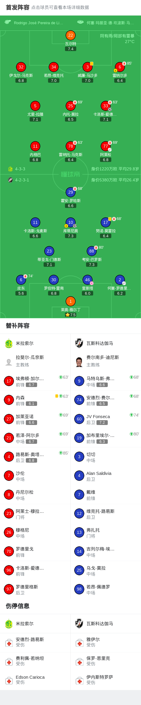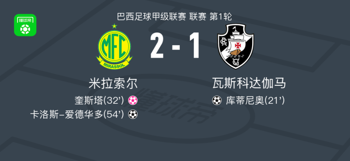 北京时间1月30日巴西足球甲级联赛 联赛 第1轮,米拉索尔主场对阵瓦斯科达伽马。米拉索尔卡洛斯-爱德华多破门。瓦斯科达伽马库蒂尼奥破门,奎斯塔自摆乌龙。最终比分米拉索尔 2-1 瓦斯科达伽马。