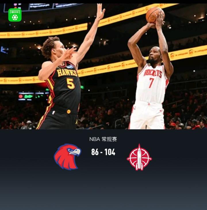 北京时间1月30日NBA 常规赛,亚特兰大老鹰对阵休斯顿火箭。上半场双方防守拉锯战,半场老鹰42-43火箭,第三节火箭杜兰特单节16分带队35-24拉开分差,末节老鹰无力反扑,最终火箭104-86大胜老鹰。