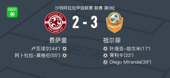 北京时间1月30日沙特阿拉伯甲级联赛 联赛 第6轮,费萨里主场对阵祖尔菲。费萨里卢瓦诺尔破门,阿卜杜拉-莫格伦破门。祖尔菲叶海亚-哈尔米破门,蒂利卡破门,Diego Miranda破门。最终比分费萨里 2-3 祖尔菲。