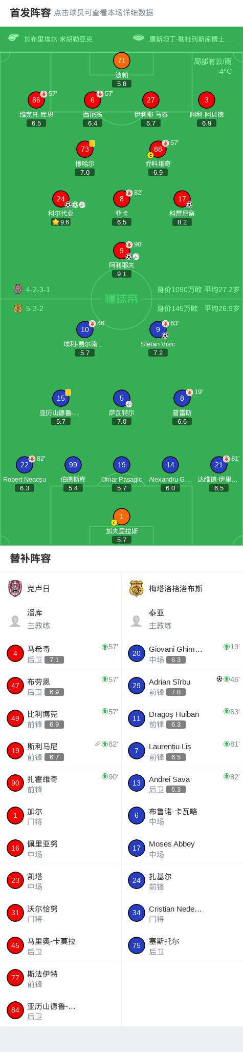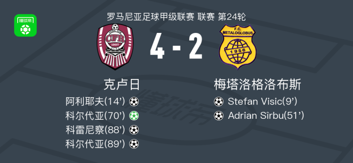 克卢日4-2逆转梅塔洛格洛布斯,科尔代亚梅开二度,科雷尼察破门