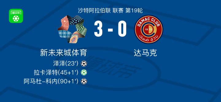 北京时间1月31日沙特阿拉伯联 联赛 第19轮,新未来城体育主场对阵达马克。新未来城体育泽泽破门,阿马杜-科内破门,拉卡泽特破门。最终比分新未来城体育 3-0 达马克。