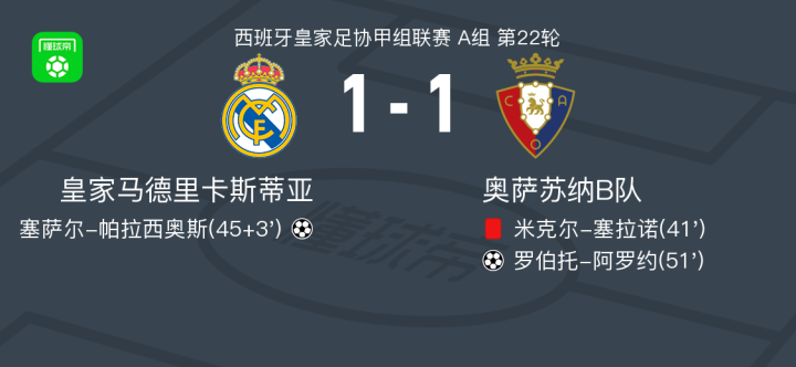 皇家马德里卡斯蒂亚1-1奥萨苏纳B队,塞萨尔-帕拉西奥斯破门,罗伯托-阿罗约扳平