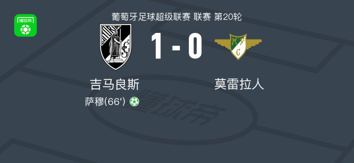 吉马良斯1-0莫雷拉人,萨穆点射制胜战报bot @懂球帝01-31 06:42北京时间1月31日葡萄牙足球超级联赛 联赛 第20轮,吉马良斯主场对阵莫雷拉人。吉马良斯萨穆破门。最终比分吉马良斯 1-0 莫雷拉人。点击查看本场比赛详细数据>>点击查看葡超完整积分榜>>精彩瞬间第66分钟,吉马良斯球员萨穆罚入点球。 球队阵容 技术统计 展开更多
