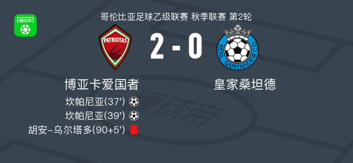 北京时间1月31日哥伦比亚足球乙级联赛 秋季联赛 第2轮,博亚卡爱国者主场对阵皇家桑坦德。博亚卡爱国者坎帕尼亚梅开二度。最终比分博亚卡爱国者 2-0 皇家桑坦德。