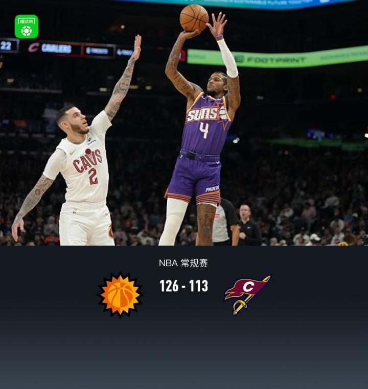 第四节太阳吉莱斯皮拿下10分,骑士奈克万-汤姆林拿下10分,最终太阳126-113战胜骑士