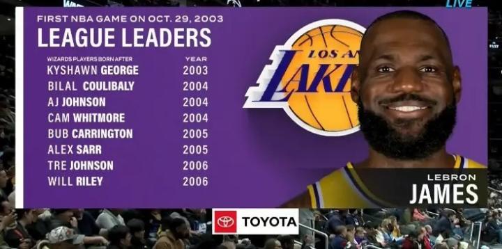 本场比赛,詹姆斯得到20分3板6助。据转播方提供数据显示,在奇才阵容中,有8名球员都在詹姆斯NBA生涯首秀后出生。