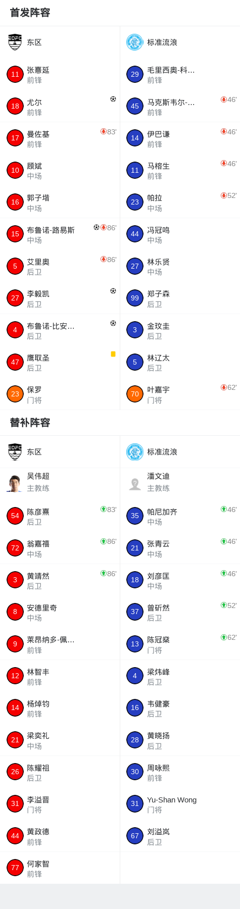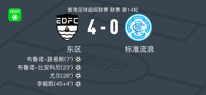 北京时间1月31日香港足球超级联赛 联赛 第14轮,东区主场对阵标准流浪。东区布鲁诺-路易斯破门,布鲁诺-比安科尼破门,尤尔破门,李毅凯破门。最终比分东区 4-0 标准流浪。