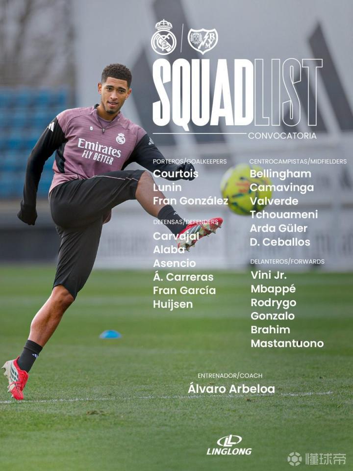 皇马战巴列卡诺大名单:姆巴佩领衔,维尼修斯、贝林厄姆在列