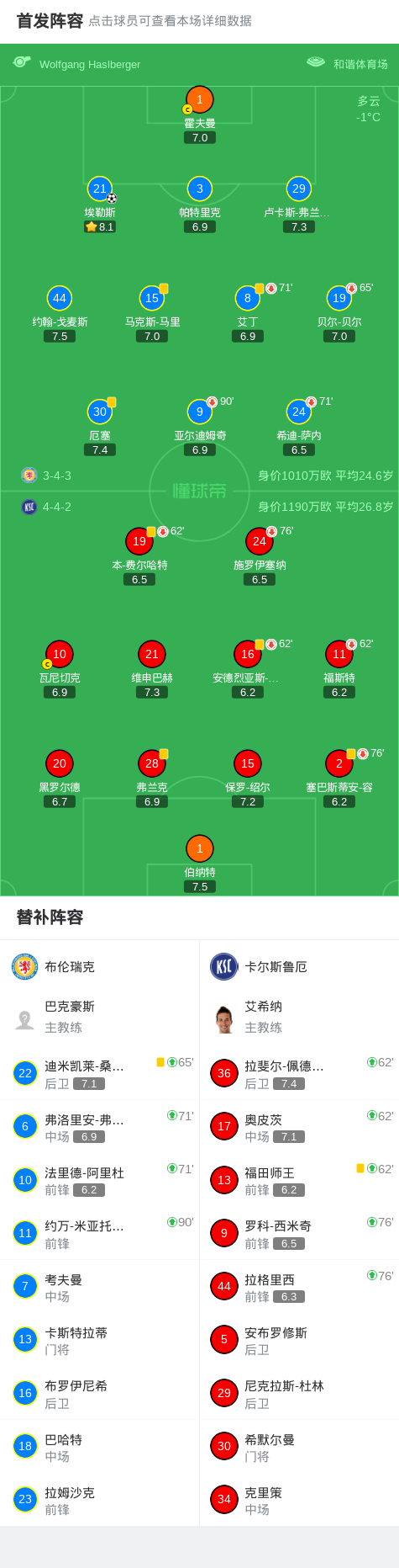 布伦瑞克1-0卡尔斯鲁厄,埃勒斯一剑封喉战报bot @懂球帝01-31 21:55北京时间1月31日德国足球乙级联赛 联赛 第20轮,布伦瑞克主场对阵卡尔斯鲁厄。布伦瑞克埃勒斯破门。最终比分布伦瑞克 1-0 卡尔斯鲁厄。点击查看本场比赛详细数据>>点击查看德乙完整积分榜>>精彩瞬间第19分钟,布伦瑞克球员埃勒斯打入一球。 球队阵容 技术统计 展开更多