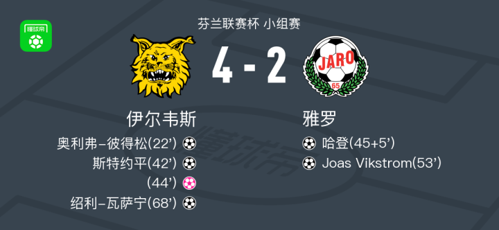 北京时间1月31日芬兰联赛杯 小组赛,伊尔韦斯对阵雅罗。伊尔韦斯奥利弗-彼得松破门,斯特约平破门,绍利-瓦萨宁破门。雅罗哈登破门,Joas Vikstrom破门。最终比分伊尔韦斯 4-2 雅罗。