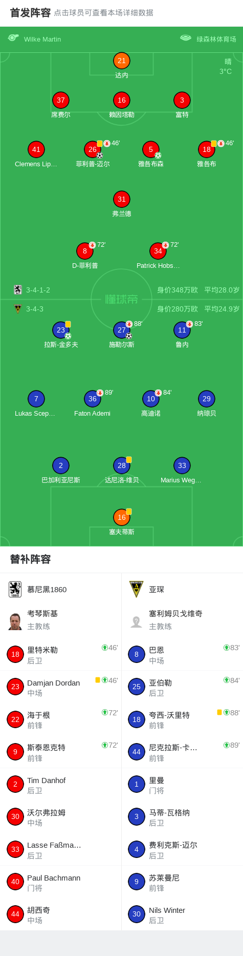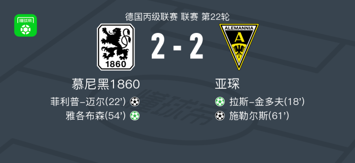 北京时间1月31日德国丙级联赛 联赛 第22轮,慕尼黑1860主场对阵亚琛。慕尼黑1860菲利普-迈尔破门,雅各布森破门。亚琛拉斯-金多夫破门,施勒尔斯破门。最终比分慕尼黑1860 2-2 亚琛。