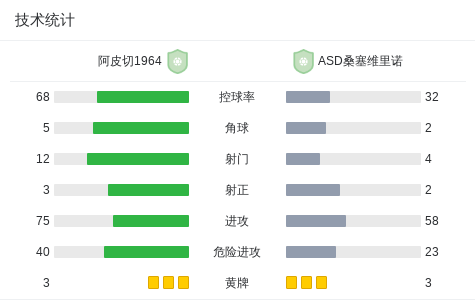 阿皮切1964 0-0ASD桑塞维里诺,难分伯仲战报bot @懂球帝01-31 23:55北京时间1月31日意卓联,阿皮切1964对阵ASD桑塞维里诺。最终比分阿皮切1964 0-0 ASD桑塞维里诺。点击查看本场比赛详细数据>> 技术统计 展开更多