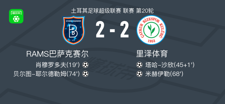 北京时间1月31日土耳其足球超级联赛 联赛 第20轮,RAMS巴萨克赛尔主场对阵里泽体育。RAMS巴萨克赛尔肖穆罗多夫破门,贝尔图-耶尔德勒姆破门。里泽体育塔哈-沙欣破门,米赫伊勒破门。最终比分RAMS巴萨克赛尔 2-2 里泽体育。