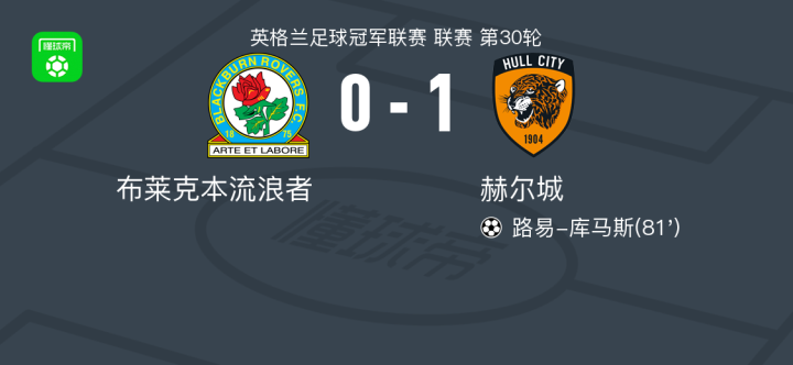 北京时间1月31日英格兰足球冠军联赛 联赛 第30轮,布莱克本流浪者主场对阵赫尔城。赫尔城路易-库马斯破门。最终比分布莱克本 0-1 赫尔城。