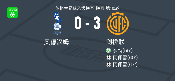 剑桥联3-0大胜奥德汉姆,阿佩雷梅开二度,奈特点射破门