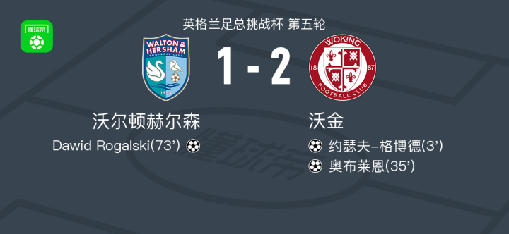 北京时间1月31日英格兰足总挑战杯 第五轮,沃尔顿赫尔森对阵沃金。沃尔顿赫尔森Dawid Rogalski破门。沃金约瑟夫-格博德破门,奥布莱恩破门。最终比分沃尔顿赫斯汉姆 1-2 沃金。