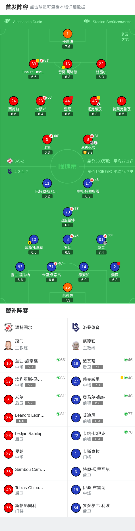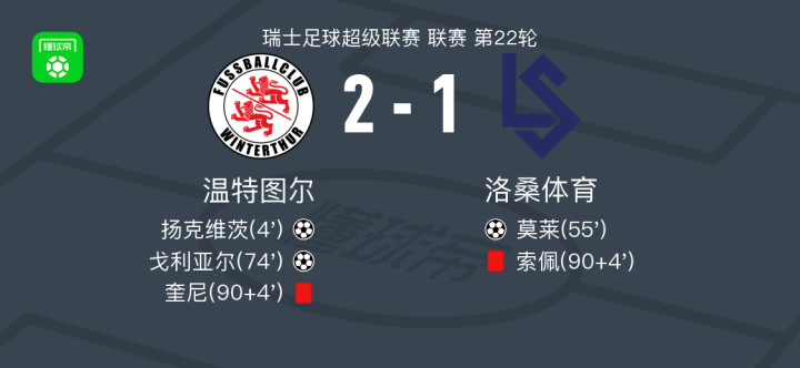 北京时间2月1日瑞士足球超级联赛 联赛 第22轮,温特图尔主场对阵洛桑体育。温特图尔扬克维茨破门,戈利亚尔破门。洛桑体育莫莱破门。最终比分温特图尔 2-1 洛桑体育。