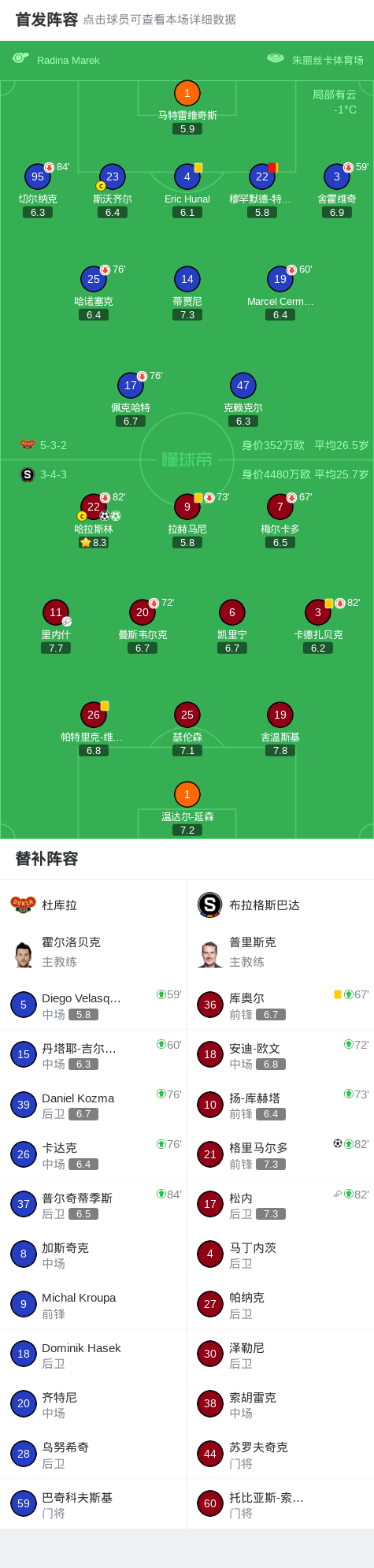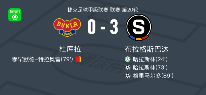 北京时间2月1日捷克足球甲级联赛 联赛 第20轮,杜库拉主场对阵布拉格斯巴达。布拉格斯巴达哈拉斯林梅开二度,格里马尔多破门。最终比分杜库拉 0-3 布拉格斯巴达。