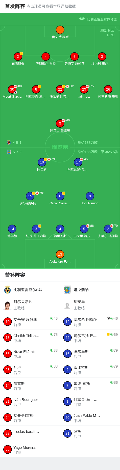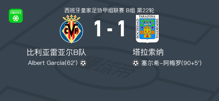 比利亚雷亚尔B队1-1塔拉索纳,Albert García打破僵局,塞尔希-阿梅罗扳平比分