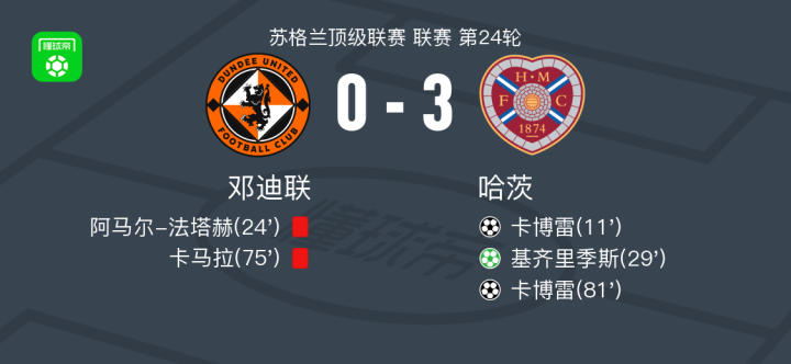 哈茨3-0大胜邓迪联,卡博雷双响,基齐里季斯点射