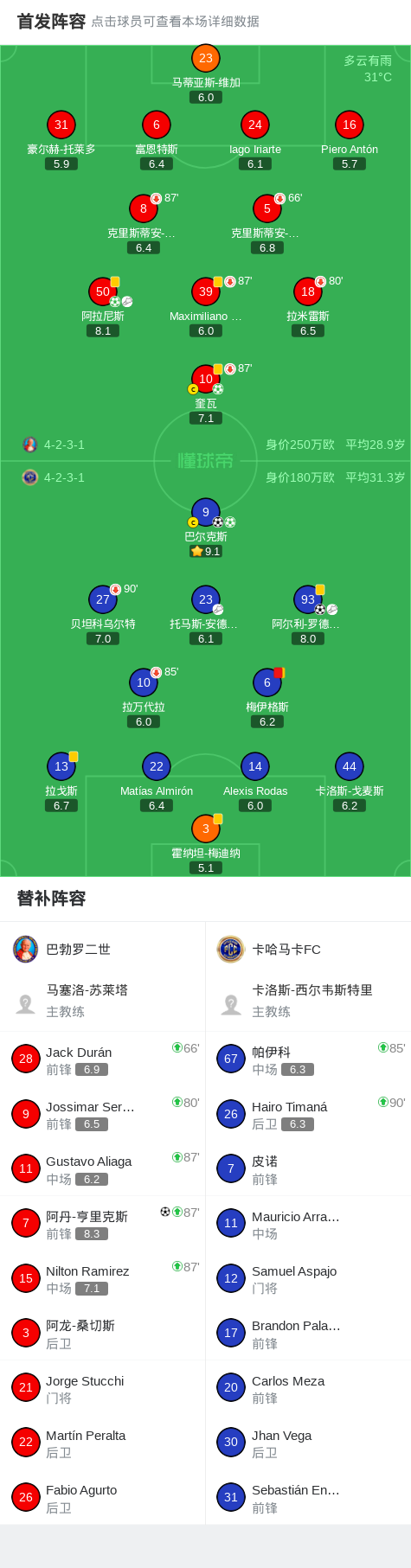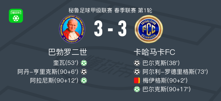 北京时间2月1日秘鲁足球甲级联赛 春季联赛 第1轮,巴勃罗二世主场对阵卡哈马卡FC。巴勃罗二世奎瓦破门,阿拉尼斯破门,阿丹-亨里克斯破门。卡哈马卡FC巴尔克斯梅开二度,阿尔利-罗德里格斯破门。最终比分巴勃罗二世 3-3 卡哈马卡FC。