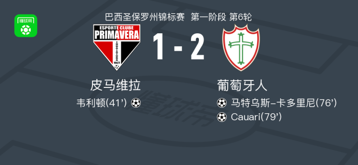 北京时间2月1日巴西圣保罗州锦标赛 第一阶段 第6轮,皮马维拉对阵葡萄牙人。皮马维拉韦利顿破门。葡萄牙人马特乌斯-卡多里尼破门,Cauari破门。最终比分皮马维拉 1-2 葡萄牙人。