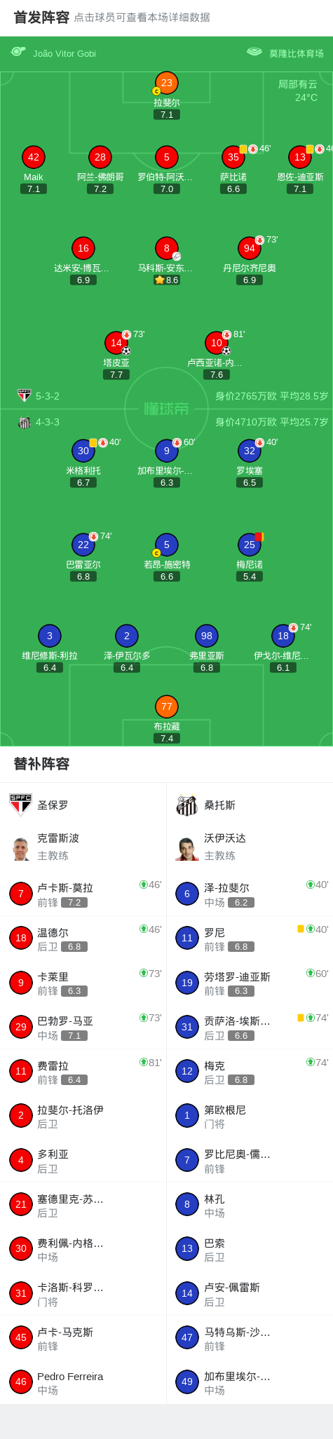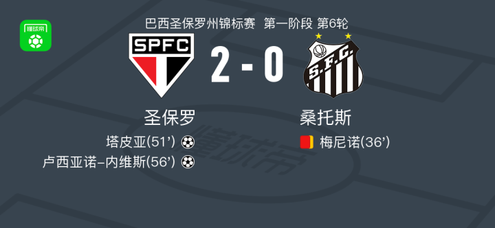 北京时间2月1日巴西圣保罗州锦标赛 第一阶段 第6轮,圣保罗对阵桑托斯。圣保罗塔皮亚破门,卢西亚诺-内维斯破门。最终比分圣保罗 2-0 桑托斯。