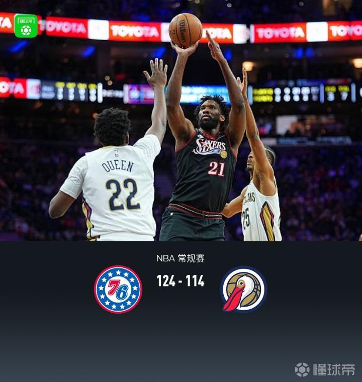 第四节76人恩比德拿下17分,鹈鹕阿尔瓦拉多拿下10分,最终76人124-114战胜鹈鹕