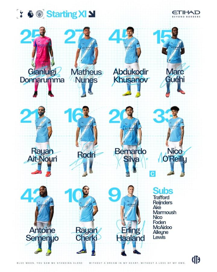 替补:1-特拉福德、4-赖因德斯、6-阿克、7-马尔穆什、14-尼科-冈萨雷斯、47-福登、56-麦卡杜、68-马克斯-阿莱恩、82-里科-刘易斯