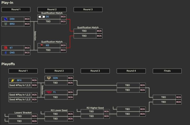 进入入围赛的战队包括DK、NS、DRX、BRO、KT、DNS,其中DK和NS从第二轮打起,赢一个BO5即可进入淘汰赛。三支战队将从入围赛突围晋级淘汰赛。