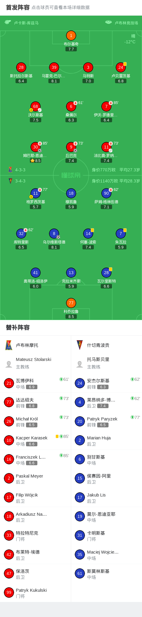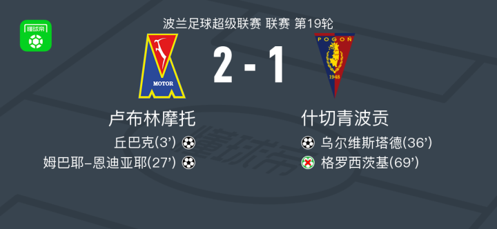 北京时间2月1日波兰足球超级联赛 联赛 第19轮,卢布林摩托主场对阵什切青波贡。卢布林摩托丘巴克破门,姆巴耶-恩迪亚耶破门。什切青波贡乌尔维斯塔德破门。最终比分卢布林摩托 2-1 什切青波贡。