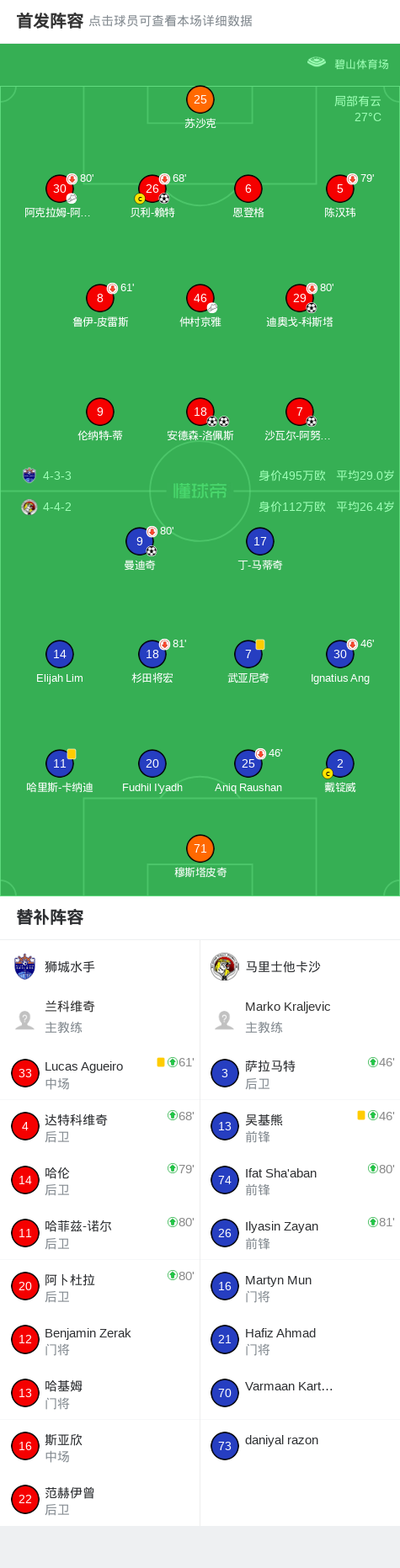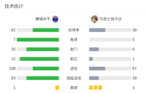 北京时间2月1日新加坡职业足球联赛 联赛 第9轮,狮城水手主场对阵马里士他卡沙。狮城水手安德森-洛佩斯梅开二度,迪奥戈-科斯塔破门,沙瓦尔-阿努阿尔破门,贝利-赖特破门。马里士他卡沙曼迪奇破门。最终比分狮城水手 5-1 马里士他卡沙。