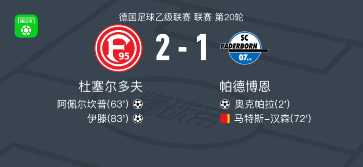 北京时间2月1日德国足球乙级联赛 联赛 第20轮,杜塞尔多夫主场对阵帕德博恩。杜塞尔多夫阿佩尔坎普破门,伊滕破门。帕德博恩奥克帕拉破门。最终比分杜塞尔多夫 2-1 帕德博恩。