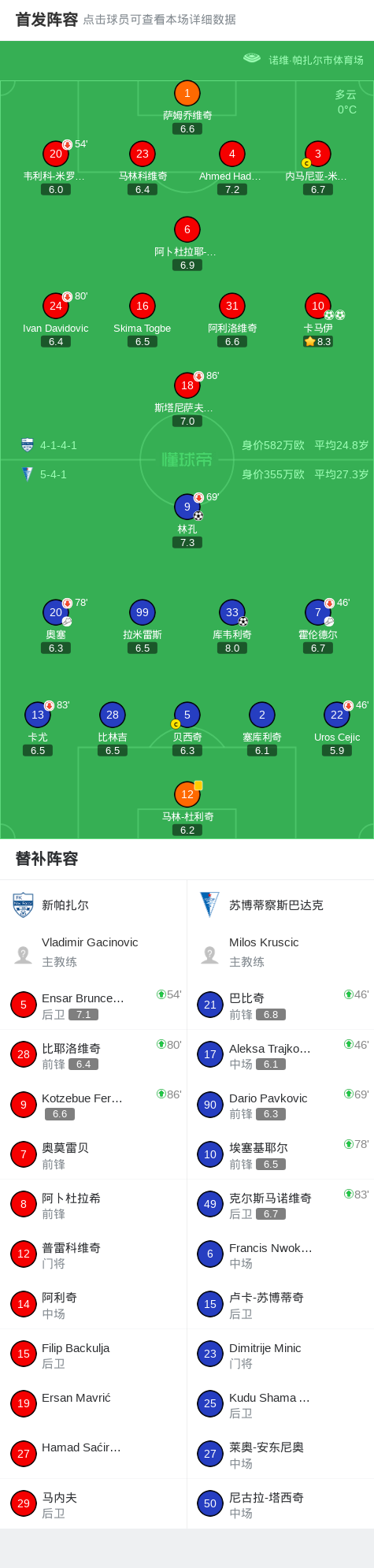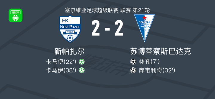 北京时间2月1日塞尔维亚足球超级联赛 联赛 第21轮,新帕扎尔主场对阵苏博蒂察斯巴达克。新帕扎尔卡马伊梅开二度。苏博蒂察斯巴达克林孔破门,库韦利奇破门。最终比分新帕扎尔 2-2 萨博迪卡。