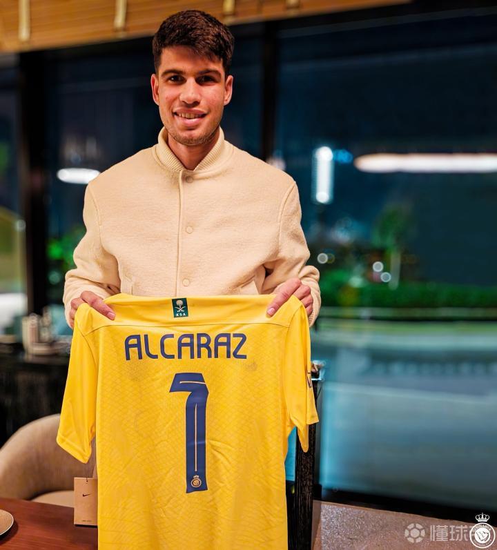 阿尔卡拉斯手持本人印号的利雅得胜利球衣