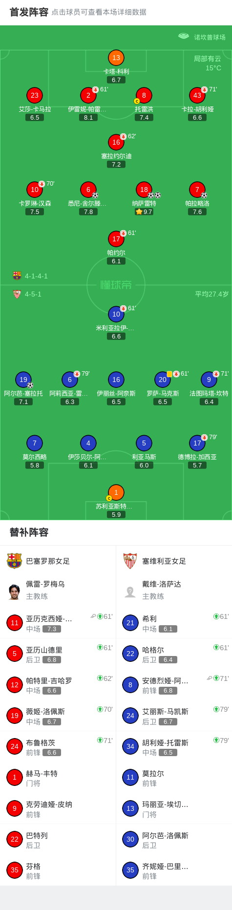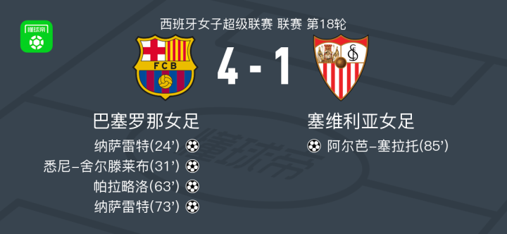 北京时间2月1日西班牙女子超级联赛 联赛 第18轮,巴塞罗那女足主场对阵塞维利亚女足。巴塞罗那女足纳萨雷特梅开二度,悉尼-舍尔滕莱布破门,帕拉略洛破门。塞维利亚女足阿尔芭-塞拉托破门。最终比分巴塞罗那女足 4-1 塞维利亚女足。