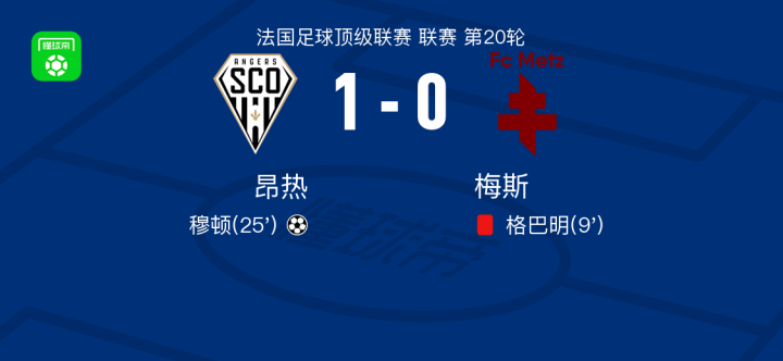 昂热1-0梅斯,穆顿助球队取胜战报bot @懂球帝02-02 02:10北京时间2月2日法国足球顶级联赛 联赛 第20轮,昂热主场对阵梅斯。昂热穆顿破门。最终比分昂热 1-0 梅斯。点击查看本场比赛详细数据>>点击查看法甲完整积分榜>>精彩瞬间第9分钟,梅斯球队格巴明吃到红牌。第25分钟,昂热球员阿尔库斯助攻穆顿打入一球。 球队阵容 技术统计 展开更多