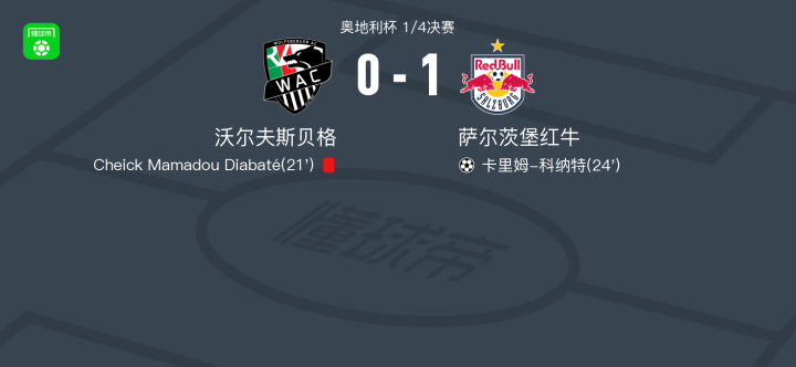 北京时间2月2日奥地利杯 1/4决赛,沃尔夫斯贝格对阵萨尔茨堡红牛。萨尔茨堡红牛卡里姆-科纳特破门。最终比分沃尔夫斯贝格 0-1 萨尔茨堡红牛。