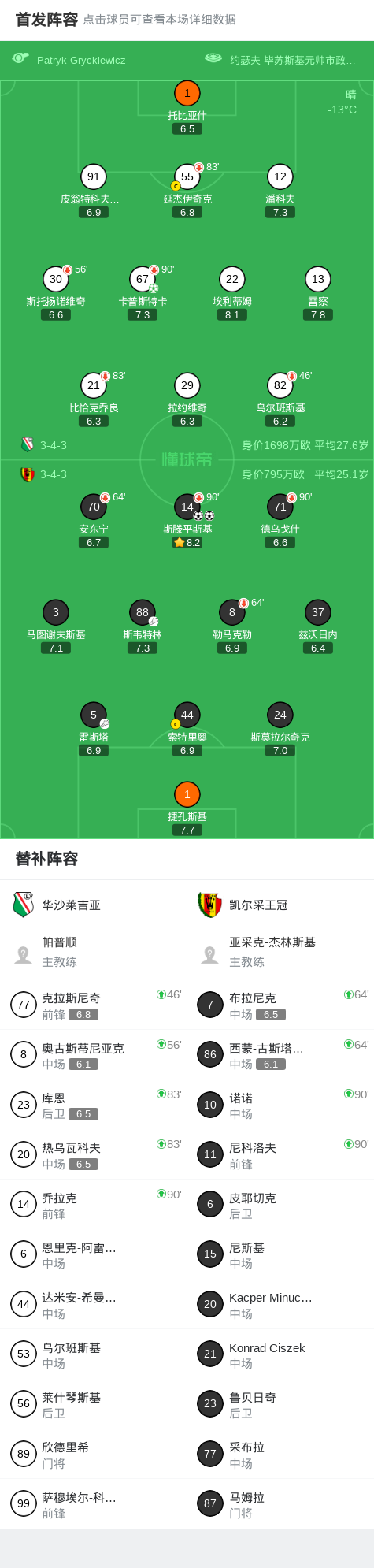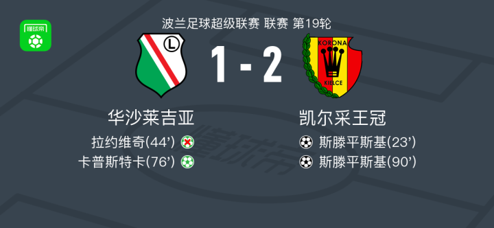 北京时间2月2日波兰足球超级联赛 联赛 第19轮,华沙莱吉亚主场对阵凯尔采王冠。华沙莱吉亚卡普斯特卡破门。凯尔采王冠斯滕平斯基梅开二度。最终比分华沙莱吉亚 1-2 凯尔采科罗纳。