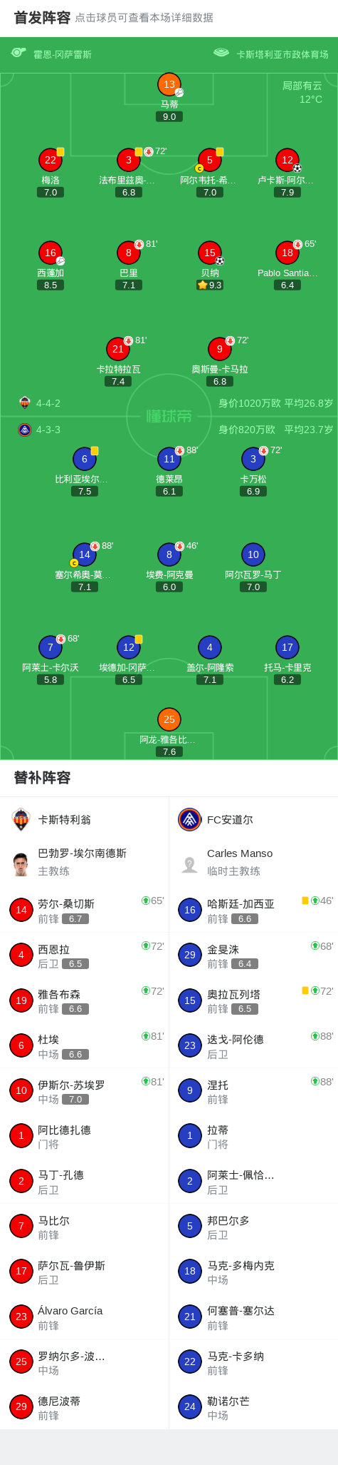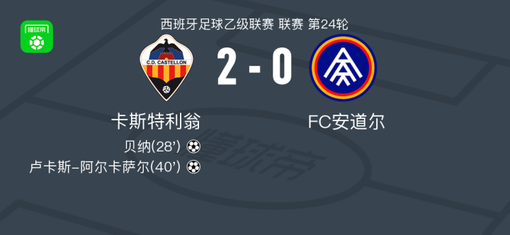 北京时间2月2日西班牙足球乙级联赛 联赛 第24轮,卡斯特利翁主场对阵FC安道尔。卡斯特利翁贝纳破门,卢卡斯-阿尔卡萨尔破门。最终比分卡斯迪隆 2-0 FC安道尔。