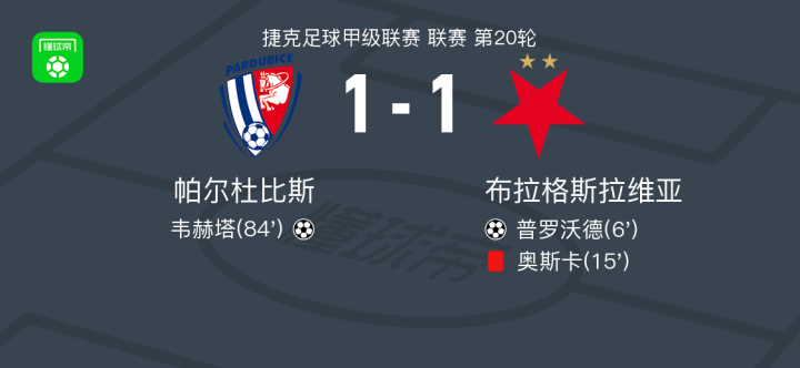 北京时间2月2日捷克足球甲级联赛 联赛 第20轮,帕尔杜比斯主场对阵布拉格斯拉维亚。帕尔杜比斯韦赫塔破门。布拉格斯拉维亚普罗沃德破门。最终比分帕尔杜比斯 1-1 布拉格斯拉维亚。