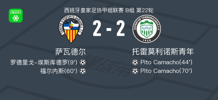 北京时间2月2日西班牙皇家足协甲组联赛 B组 第22轮,萨瓦德尔主场对阵托雷莫利诺斯青年。萨瓦德尔罗德里戈-埃斯库德罗破门,福尔内斯破门。托雷莫利诺斯青年Pito Camacho梅开二度。最终比分萨瓦德尔 2-2 托雷莫利诺斯青年。