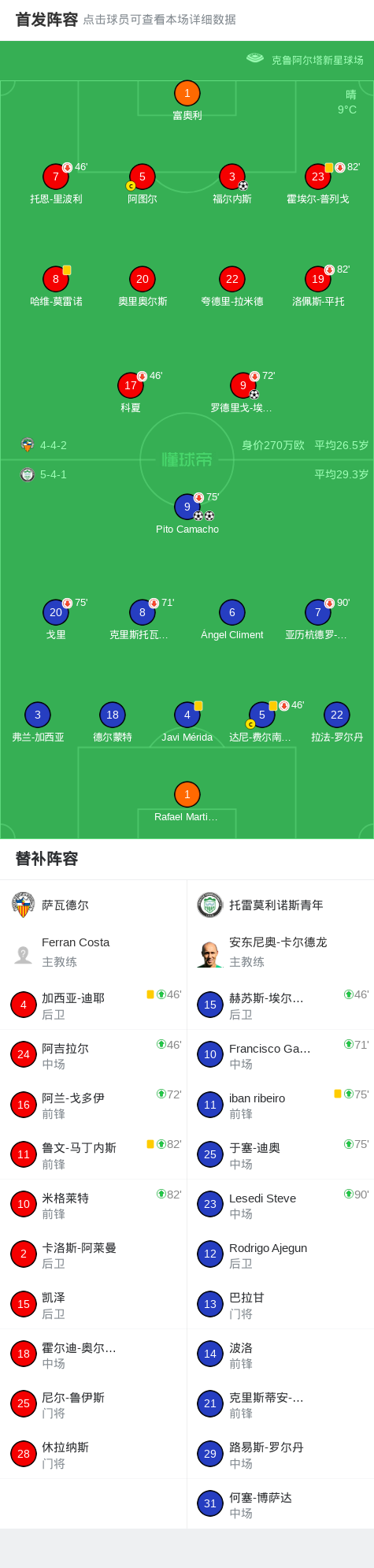 第9分钟,萨瓦德尔球员罗德里戈-埃斯库德罗打入一球。