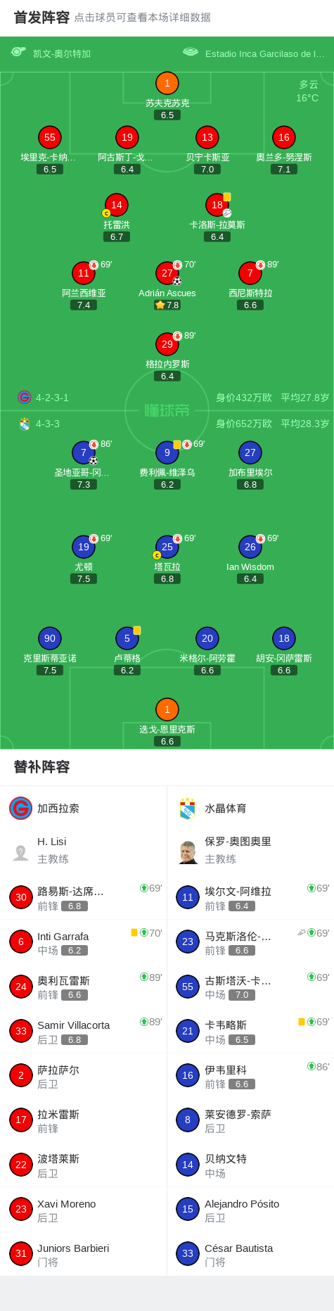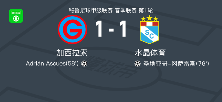 北京时间2月2日秘鲁足球甲级联赛 春季联赛 第1轮,加西拉索主场对阵水晶体育。加西拉索Adrián Ascues破门。水晶体育圣地亚哥-冈萨雷斯破门。最终比分加西拉索 1-1 水晶体育。