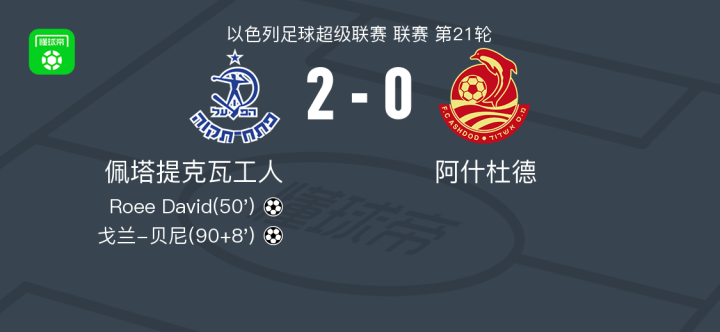 北京时间2月2日以色列足球超级联赛 联赛 第21轮,佩塔提克瓦工人主场对阵阿什杜德。佩塔提克瓦工人Roee David破门,戈兰-贝尼破门。最终比分佩塔提克瓦工人 2-0 阿什杜德。