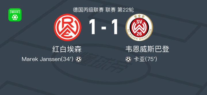 北京时间2月2日德国丙级联赛 联赛 第22轮,红白埃森主场对阵韦恩威斯巴登。红白埃森Marek Janssen破门。韦恩威斯巴登卡亚破门。最终比分红白埃森 1-1 韦恩威斯巴登。