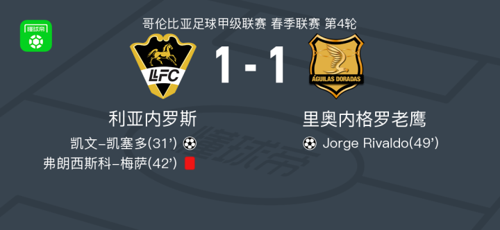 北京时间2月2日哥伦比亚足球甲级联赛 春季联赛 第4轮,利亚内罗斯主场对阵里奥内格罗老鹰。利亚内罗斯凯文-凯塞多破门。里奥内格罗老鹰Jorge Rivaldo破门。最终比分利亚内罗斯 1-1 里奥内格罗老鹰。