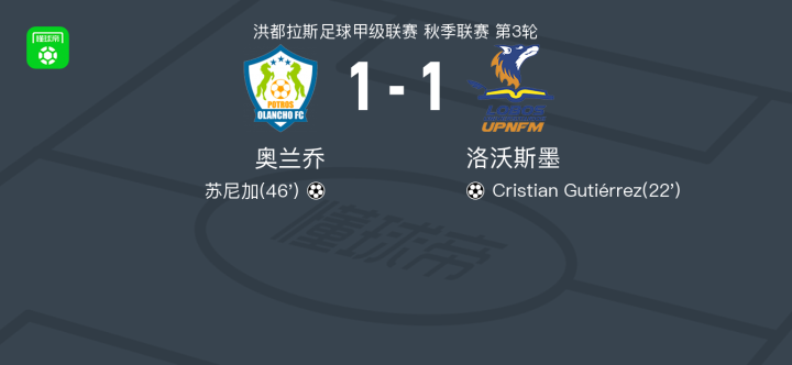 北京时间2月2日洪都拉斯足球甲级联赛 秋季联赛 第3轮,奥兰乔主场对阵洛沃斯墨。奥兰乔苏尼加破门。洛沃斯墨Cristian Gutiérrez破门。最终比分奥兰乔 1-1 洛沃斯墨。