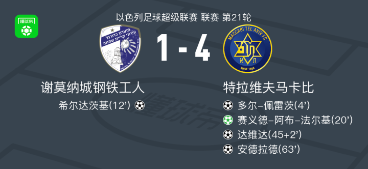 北京时间2月3日以色列足球超级联赛 联赛 第21轮,谢莫纳城钢铁工人主场对阵特拉维夫马卡比。谢莫纳城钢铁工人希尔达茨基破门。特拉维夫马卡比多尔-佩雷茨破门,达维达破门,安德拉德破门,赛义德-阿布-法尔基破门。最终比分谢莫纳城钢铁工人 1-4 特拉维夫马卡比。