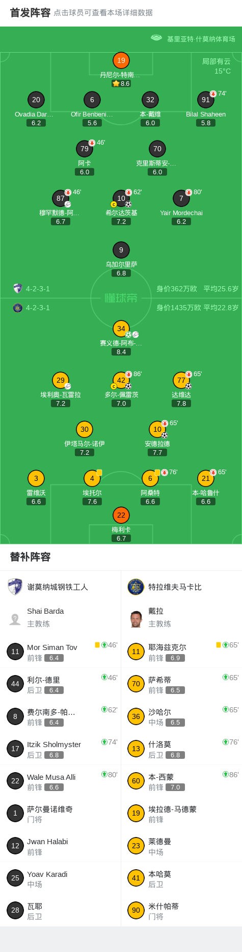 上半场补时第2分钟,特拉维夫马卡比球员埃利奥-瓦雷拉助攻达维达打入一球。